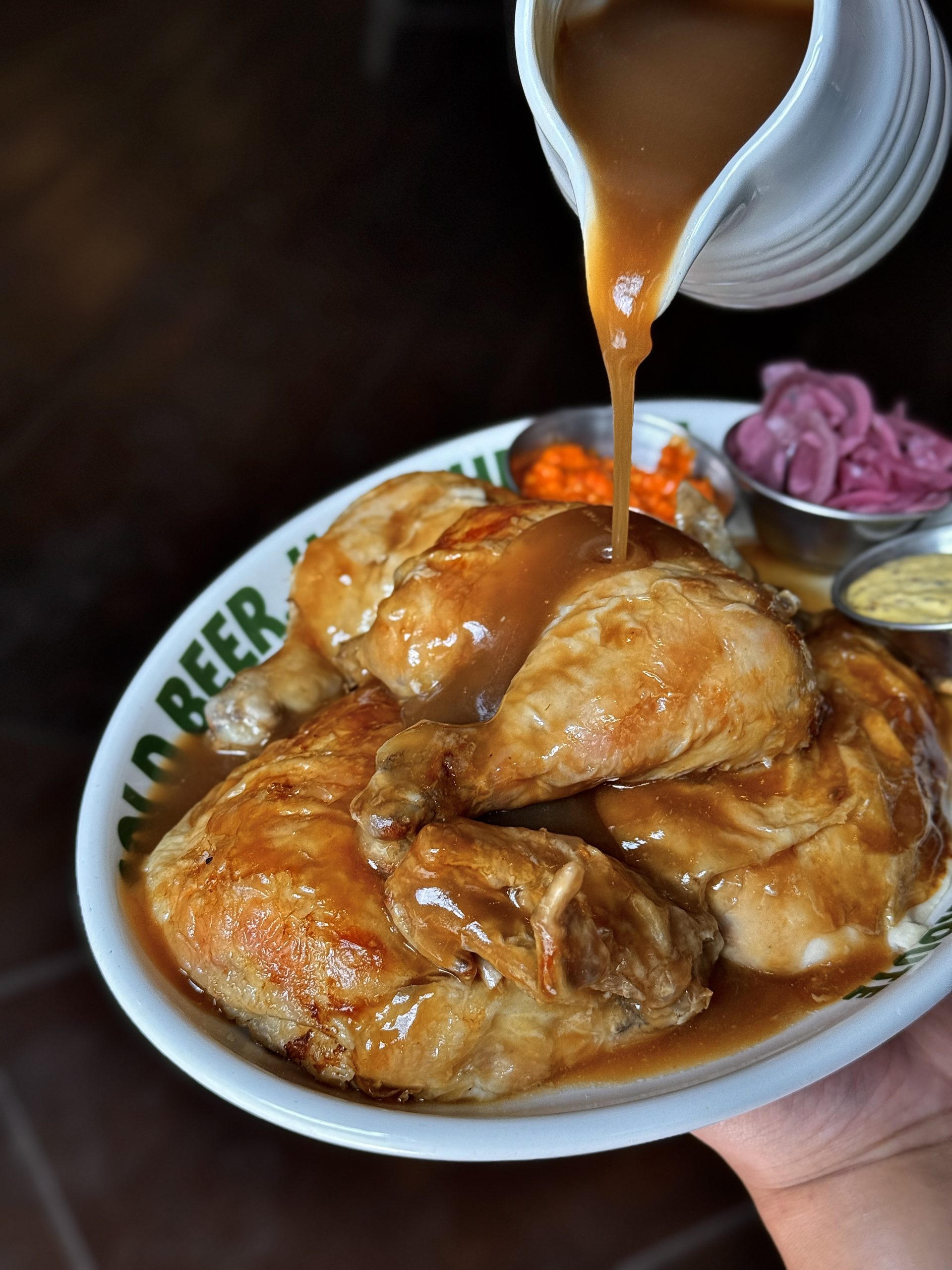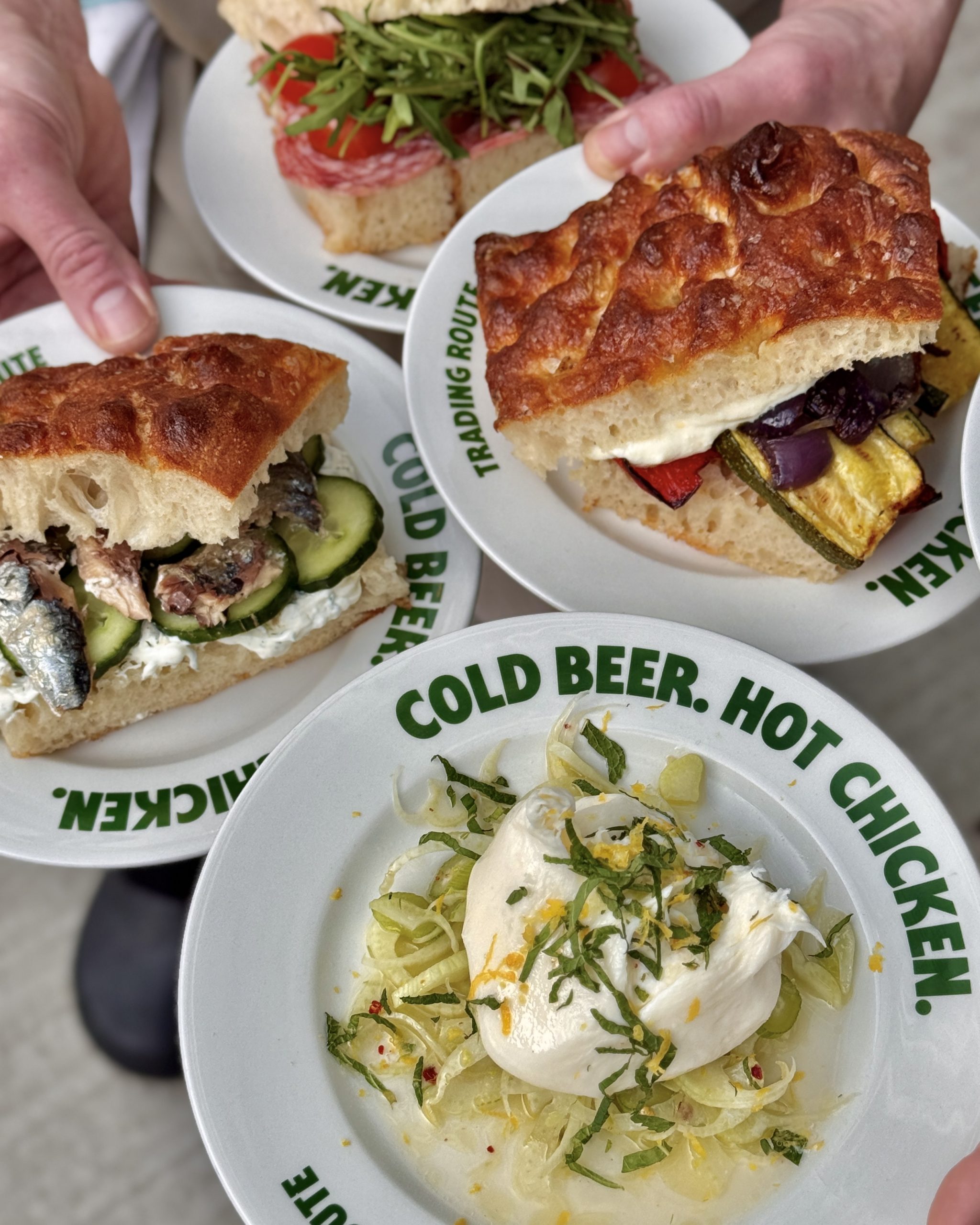 Rooted in European beer hall tradition but cooked with unmistakable Mancunian spirit, our menu is built around hearty, satisfying food done properly. The rotisserie ovens are the beating heart of the kitchen – slow-roasting whole and half chickens until perfect, then finishing them with our signature beer salt crumb and house pickles. Alongside the rotisserie, we bake our own focaccia daily, the base for a short but considered sandwich menu – among them “The Classic” with pistachio pesto, and “The Corrie” with coronation chicken. Rounding things out are our Beer Bites: think Bavarian Manc & Cheese, rotisserie potatoes with pecorino, and plenty more to graze on.